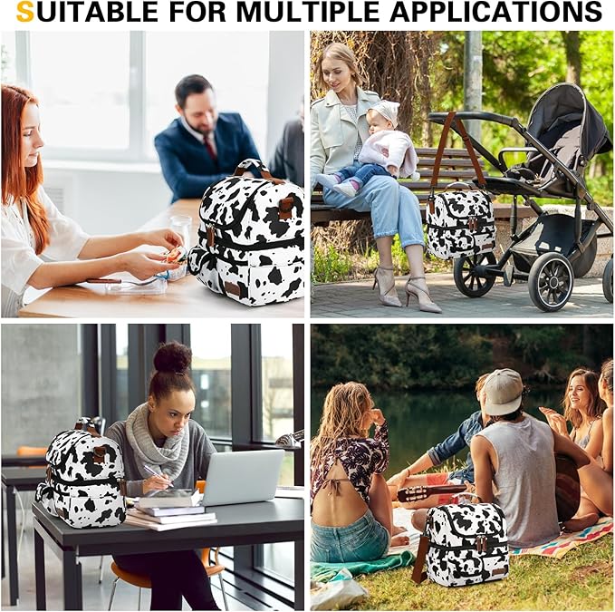 • 【Stylish&Cute Cow Print Design】Lokass women's lunch bag is designed with cow print, and its cute and fashionable appearance is very much in line with the aesthetics of the youthful and beautiful young people. The brown handle strap makes it reveal a touch of classic in the cute, and the adjustable shoulder strap also provides you with a variety of convenient carrying methods which makes it a great choice for work on weekdays!