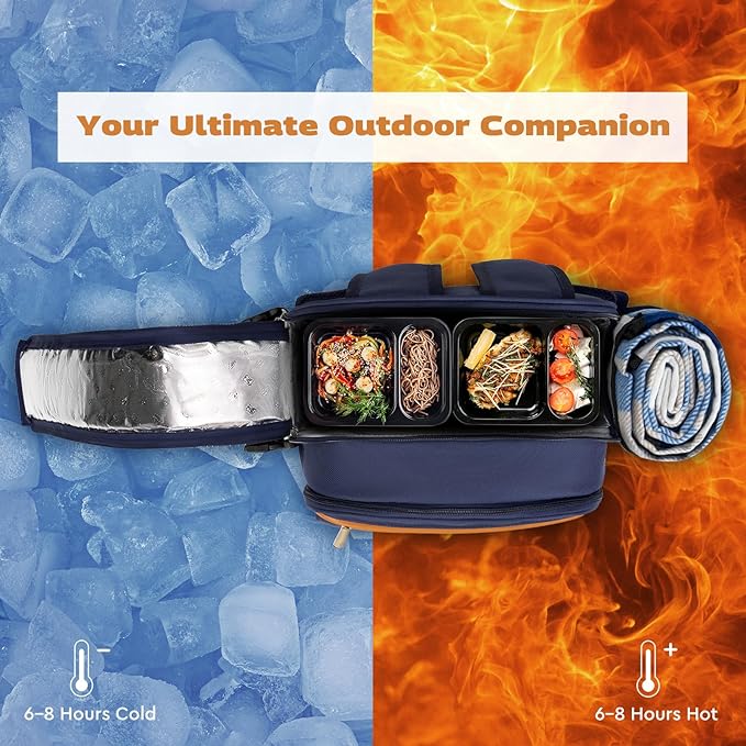 • LARGE CAPACITY & WELL EQUIPPED: Size: 12(L)x7.5(W)x15(H) inches, 5.2 lb; The 22L high-capacity picnic backpack big enough to accommodate the ingredients needed for a picnic. Includes a full set of camping accessories: backpack cooler, picnic blanket, wine bag, cutlery and cutting board, etc. The camping backpack bag is made of 100% polyester fabric and 5mm PE foam and PU layer, which can keep the hot/cold/fresh for hours.