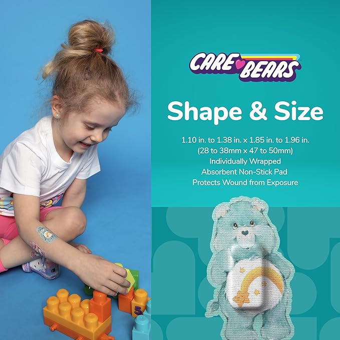 • SAFE PACKAGING: These sterile Care Bears cartoon character bandages come in cute and adorable packaging, and are individually wrapped for safe handling; small bandages help protect kids' sensitive wounds from coming into contact with dirt for first aid wound care