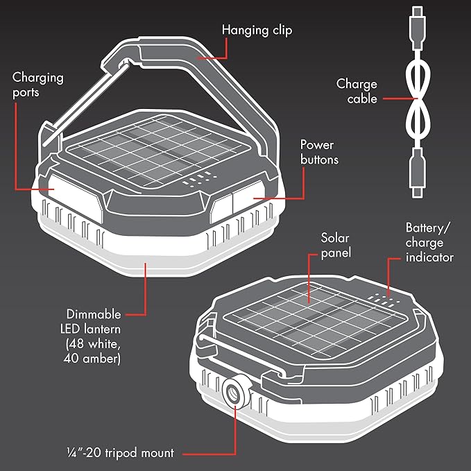 • 【THE COMPACT LANTERN】 - A simple sounding name for a feature-packed lantern! Two dimmable LED colors, Rechargeable power bank, Solar powered, Tripod mountable, folding carabiner-type hanging clip, and it's compact size make this the ultimate camping lantern.