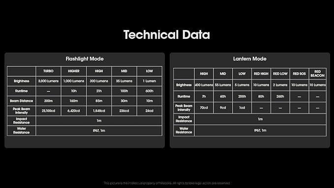 • SUPER BRIGHT LANTERN FLASHLIGHT - The Nitecore LR70 is a versatile 3-in-1 camping lantern, flashlight, and backup power source. In flashlight mode, it produces up to 3000 lumens with a 328 yard beam. In lantern mode, it emits 400 lumens with red light mode and runs up to 7 hours on the high mode.