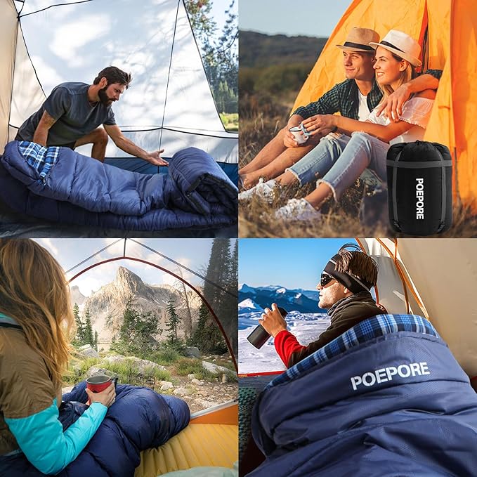 • Multiple Scenes: The sleeping bag comes with a compression bag, allowing easy rolling and convenient portability. Whether it's camping, traveling, outdoor adventures, or indoor overnight stays, the sleeping bag provides a comfortable sleeping environment. It also offers additional insulation in lower temperatures or harsh environments, protecting users from cold or damp conditions. Therefore, the POEPORE sleeping bag is an essential piece of equipment for outdoor enthusiasts and travelers.