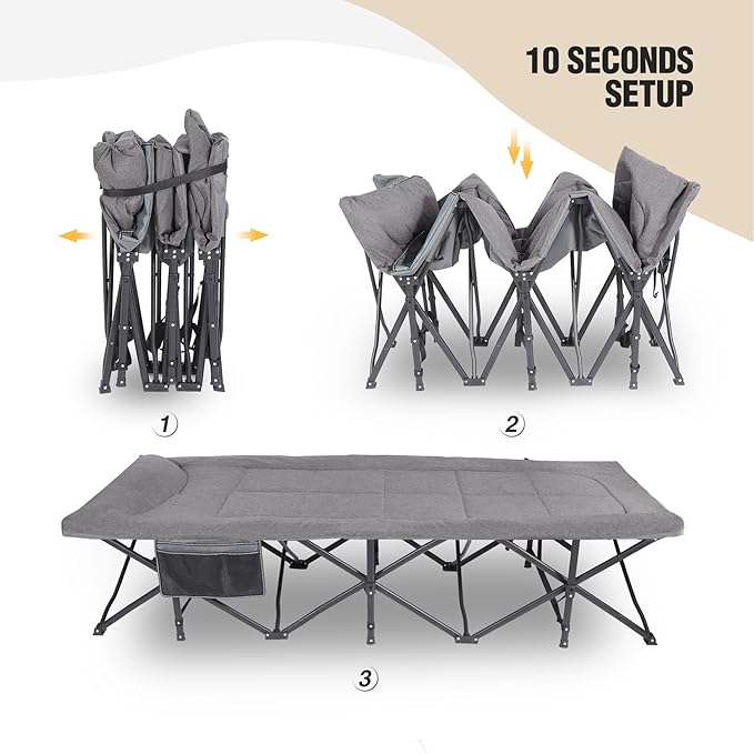 • Foldable & Portable: No eatra tools are needed to install the camping cot. You can open it within 10 seconds. Easy to fold when not in use. You can fold it in the equipped storage bag, then place it anywhere without occupying sapce.