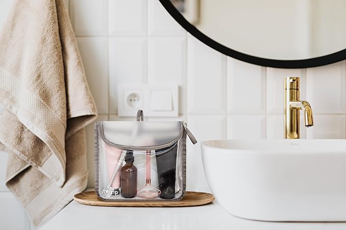 • HANGING LOOP: Hang the bag from a hook in your hotel bathroom or from the door of your gym locker. The clear front panel lets you see what's inside without having to open the bag, so you can quickly find what you're looking for.