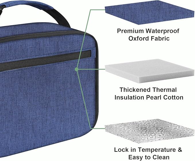 • ✱Spacious Space: The portable lunch bag comes with multiple storage room, including zipper storage pockets for tissues or snacks, side mesh pockets for water bottle and internal storage pockets for Spoon or fork. All in all, our lunch box has enough space for daily need