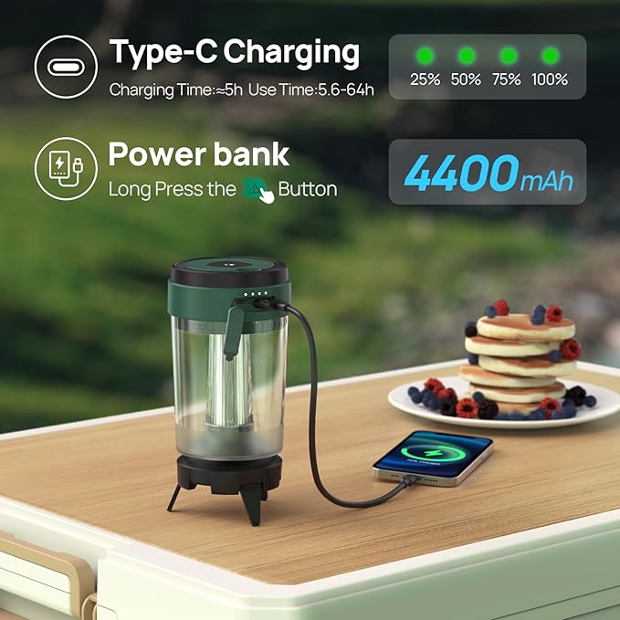 • 🔋 Rechargeable & Power Bank - 2 interfaces (USB Type-C Input & USB Type-A Output). Visible 4 stage charging indicator LED lights, only 5 hours to be fully charged, and enjoy runtimes from 5 to 64 hours in different light modes and brightness (15~425lm). Built-in 4400mAh battery to charge your phone and tablet anywhere (Note: Long press the red light controlled button to enter the Power Bank Mode. Turn on the light will automatically exit the power bank mode)