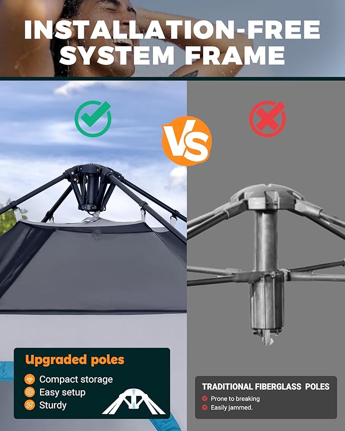 • QUICK SETUP & STORAGE: No tools required! Simply unfold the tent, extend the poles, and listen for the "click" sound to complete the setup. The entire process takes just 60 seconds, offering a hassle-free and quick shower tent experience. Comes with a storage bag for easy transport, with packed dimensions of 44" x 8" x 8".