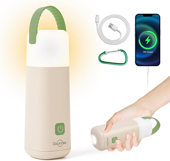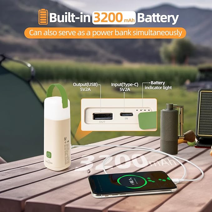 • 【Bright & Power Bank】This multifunctional camping light is equipped with an internal 3200mAh rechargeable lithium battery. When fully charged, it can operate for 10-350 hours in night light mode or 9-200 hours in flashlight mode. It features a Type-C charging port and a USB-A discharge port, enabling it to serve as a temporary power bank for charging your devices.Please use the 5V/2A DC adapter (NOT INCLUDED) to charge this Lantern.