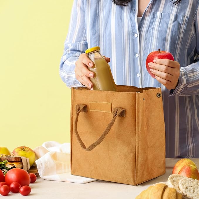 • Safe Material and Design Innovation: this reusable thermal lunch bag is crafted from robust high density polyethylene fiber; This smartly constructed bag is brown, subtly exuding an understated elegance; It provides not only an aesthetic appeal but is also well durable, further enhancing its longevity and trustworthiness