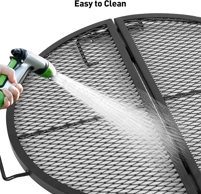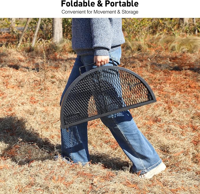 • 【Foldable & Portable】 Our round fire pit cooking grate can be folded in half for carrying and storing easily. Folded size is 24x12x2inches/61x30x5cm. Net weight: 7.5lbs/3.4kg. You can carry or move it easily with its two solid handles.