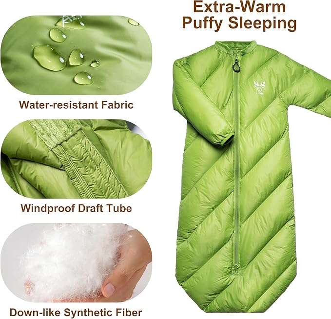 • CUSTOMIZABLE WARMTH & MOBILITY: Designed with unique sleeves featuring adjustable open & close cuffs, plus the draft tube protected 2-way zipper, this sleeping bag offers a personalized warmth experience while remaining hands free and certain mobility, making it perfect for outdoor adventures, or indoor forts and slumber parties.