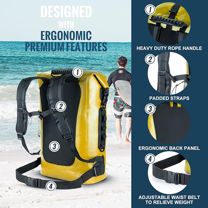 • 【DURABLE WATERPROOF FABRIC】 The waterproof backpack adopt 500D PVC heavy duty waterproof backpack material, 35L waterproof backpack dry bag has excellent waterproof, dustproof and scratchproof performance. Ensure your gear stays dry while kayaking, floating, swimming, boating, fishing, rafting, surfing, biking, traveling, camping, ect. The dry bag backpack suits various outdoor activities.