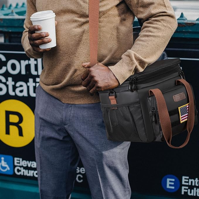 Tactical Lunch Box for Men- Large Insulated Lunch Bag-Expandable Adult Lunch Box with Adjustable Shoulder Strap-Large Lunch Tote Bag for Work Camping Fishing (Black-Leather)