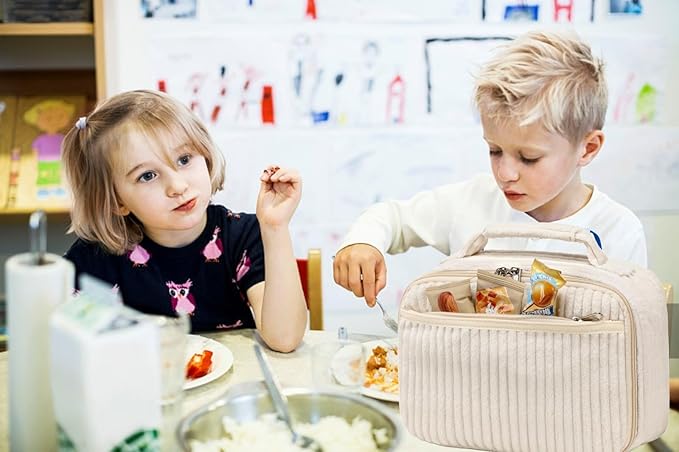 • The Corduroy Reusable Kids Lunch Box is made of the durable polyester material, safe aluminum foil insulated lining, BPA free, that is good for kid's health. The padding, stitching, fabric, liner, sturdy zippers, and overall construction is quality.