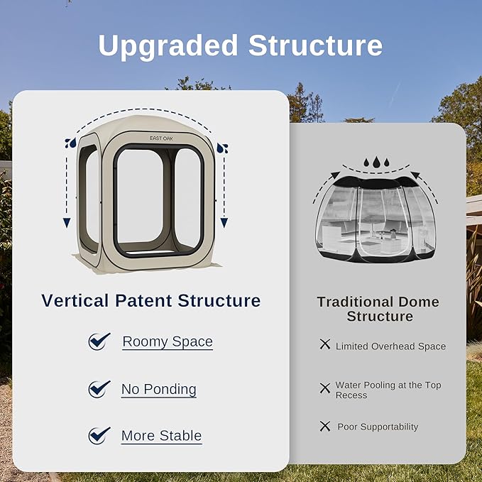 • ๐—ฅ๐—ผ๐—ผ๐—บ๐˜† ๐—ฆ๐—ฝ๐—ฎ?๐—ฒ & ๐—จ๐—ฝ๐—ด๐—ฟ๐—ฎ๐—ฑ๐—ฒ๐—ฑ ๐——๐—ฒ๐˜€๐—ถ๐—ด๐—ป: This screen house frame is made of durable 300D Oxford fabric and rust-resistant steel structure. The top structure is supported by heavy-duty fiberglass, which prevents water from accumulating and delivers more space. The zipper can be used on both sides, and its connection with the tent is upgraded with doulble stitching, making it less likely to tear. The door curtain can befixed to the side for easy access