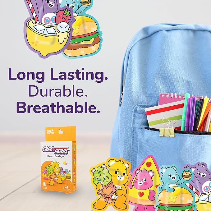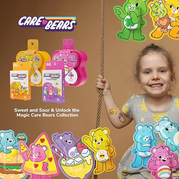 • CARE BEARS BANDAGES: This 24 piece pack of Care Bears bandages feature fun Wish Bear, Funshine Bear, Share Bear, and Cheer Bear shapes, and is great for putting a smile on kids' faces while protecting wounds such as cuts, scrapes, and burns; sticky bandages come in a cute cardboard box and are perfect for kids and adults alike, and also for school nurses and pediatric doctors