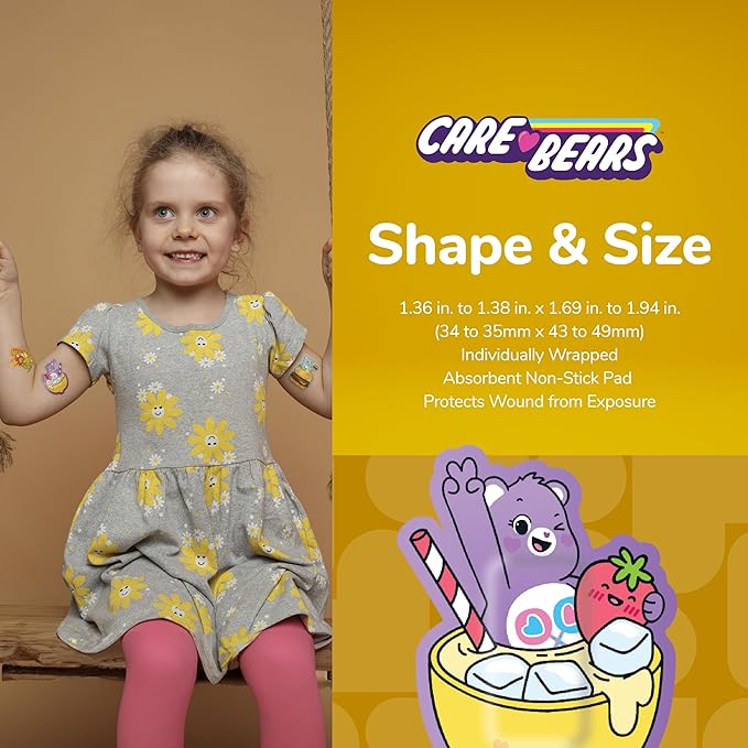 • SAFE PACKAGING: These sterile Care Bears cartoon character bandages come in cute and adorable packaging, and are individually wrapped for safe handling; small bandages help protect kids' sensitive wounds from coming into contact with dirt for first aid wound care