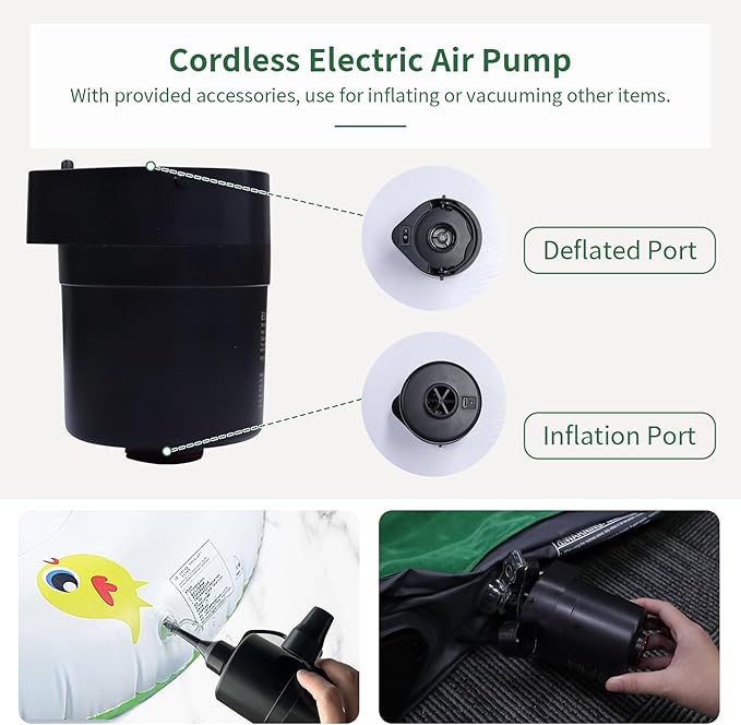 • Detachable Electric Pump: The camping air mattress features a unique built-in pump,detachable for versatile use. Inflate outdoor essentials like inflateable rafts,paddle boards,camping pillows and more without needing external power.