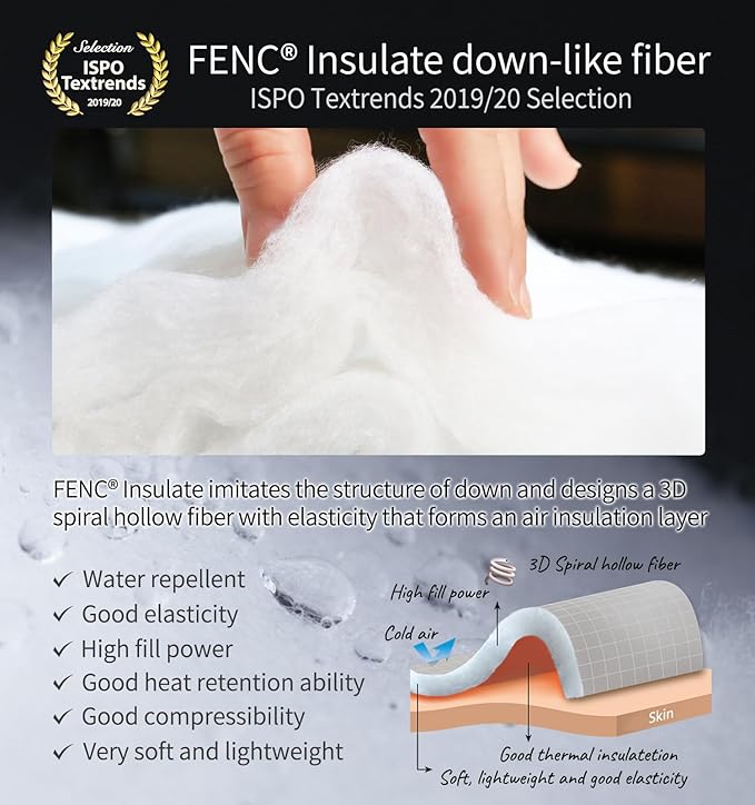 • Material : Inner Material: Velvet Lining (Polyester), Outer Materiel: Polyester / Fill material: FENC insulate down like fiber (Polyester) Inner Material: Velvet Lining (Polyester), Outer Materiel: Polyester / Fill material: FENC insulate down like fiber (Polyester)