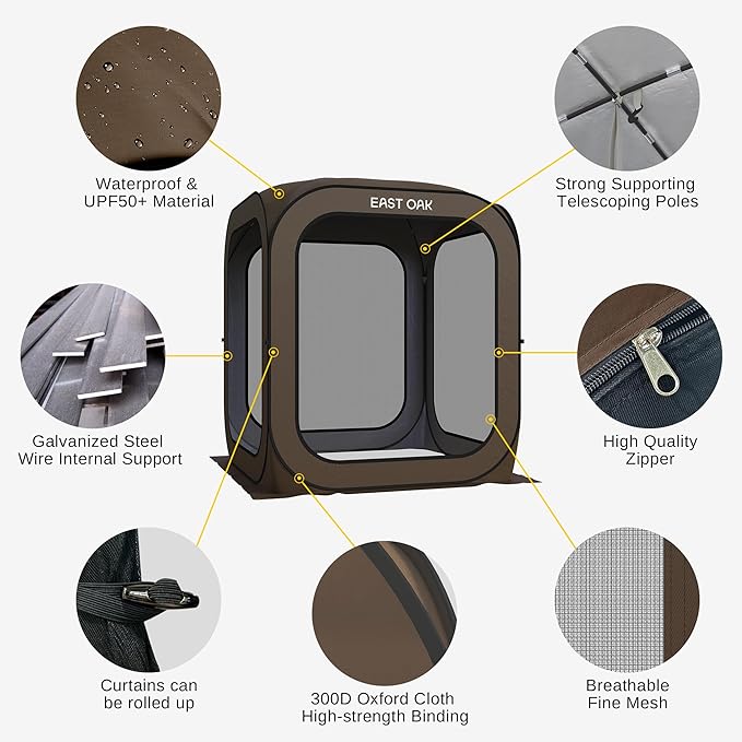 • ๐—•๐˜‚๐—ด-๐—ฃ๐—ฟ๐—ผ๐—ผ๐—ณ & ๐—ฉ๐—ฒ๐—ป๐˜๐—ถ๐—น๐—ฎ๐˜๐—ฒ๐—ฑ: The EAST OAK portable pop-up screen teent features a 4-sided B3 fine mesh design for 360ยฐ perfect ventilation to protect you from mosquitoes, bugs and anything the outdoors can throw at you. The tent body is made of high-quality Oxford fabric with anti-UV silver coating to achieve all-day UPF 50+ UV protection. Perfec for picnics, camping, and the beach
