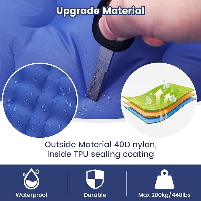 • 🌜Camping Grade Material🌛 KASIMO inflatable sleeping mat is made of tough 40D nylon, multi-layer waterproof and thick TPU coating, providing ultra pressure-bearing and durability which could supports 200lbs, no worry about air leaks or tears. Besides this camping mattress is easy to clean with a damp cloth