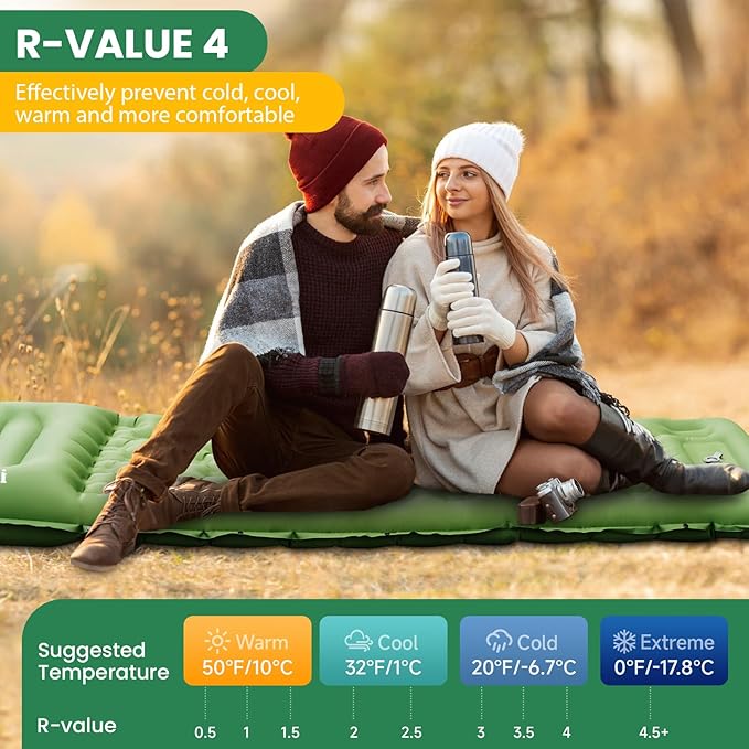 • ⛺【Warm & Comfortable Camping Pad】Our camping mattress is R-Value 4, effectively insulating coldness! The 3.9‘’ thick inflatable sleeping mat provides effective support to keep you away from the ground and ensure the warmth of the night! The front of the ergonomics pillow can fit the cervical spine, and the side can support the face. Various sleeping positions can make you feel relaxed and comfortable!