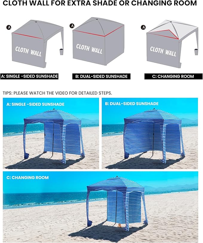 • 2024 Upgrade Beach Cabana: Qipi beach cabana tent featuring changing room or single or dual-side sunshade (view the video for detail steps). Changing room: Hang the hooks on the cabana frame to create a triangular shape, and zip it up.