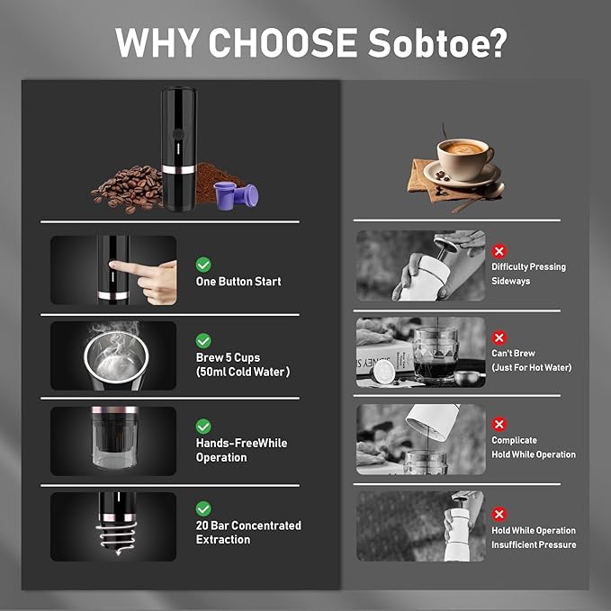 • Sobtoe UPGRADED PORTABLE ESPRESSO MACHINE:The most advanced mini espresso machine, making espresso coffee easier! The upgraded version automatically heats water and extracts espresso at the touch of a button. The coffee cup rises to 2.9'', freeing your hands from handheld portable espresso maker when extracting espresso.