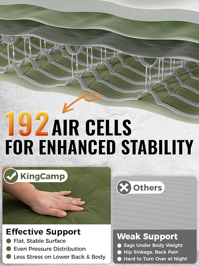 • SUPERIOR SUPPORT: The inflatable mattress features a columnar rib structure with 192 internal support columns, providing excellent stability and improved comfort. Whether you're camping on rough terrain or using it in your vehicle, this mattress ensures firm support for a restful sleep, reducing fatigue and enhancing your outdoor experience.