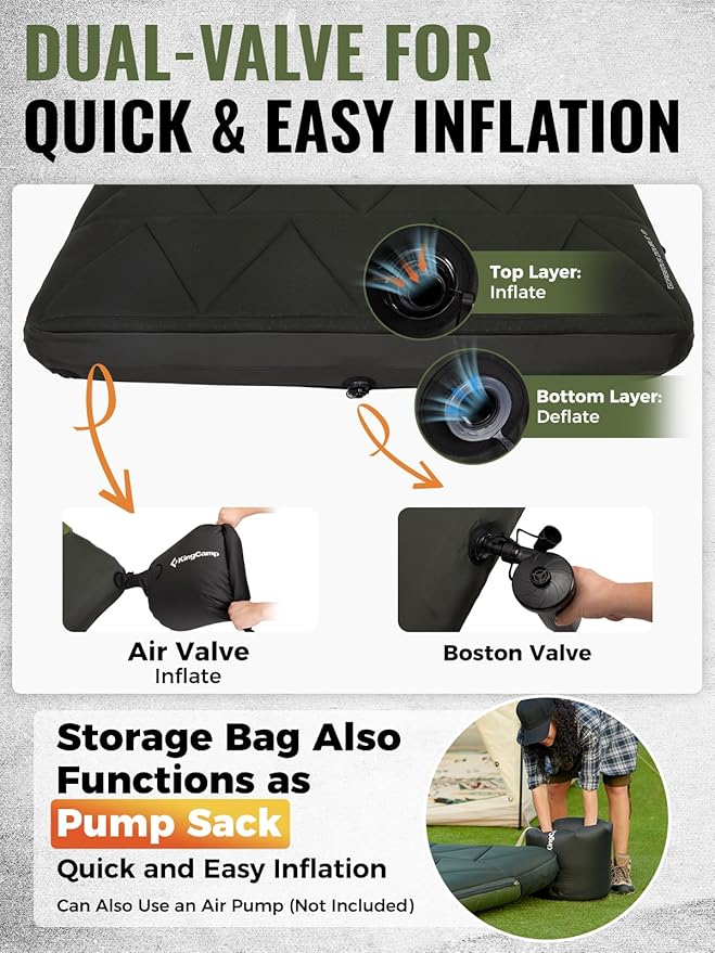 • QUICK INFLATION & DEFLATION: This air mattress includes two types of valves: a pinch valve and a Boston valve, allowing for fast inflation and deflation. The included pump sack connects to the pinch valve for easy inflation, while the Boston valve provides quick air release when deflating. Whether you're inflating or packing up, it's quick and effortless, saving you time during your outdoor adventures.