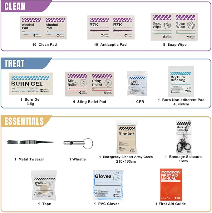 • 【First Aid Survival Kit---Great Solution to Outdoors Prepareness】 We interviewed outdoor experts and first aid pros to understand what gear they trusted day in and day out. During this process, we developed this handy emergency kit. RHINO RESCUE classic style small molle pouch is compact and portable. Most basic first aid and survival essentials are included in this kit. The first aid pouch is a must-have for your bug-out bag.