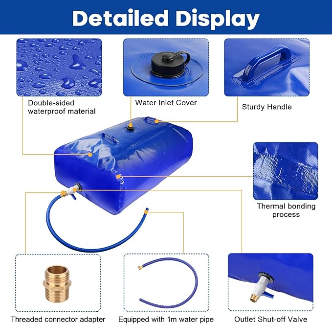 • Collapsible Water Storage Bladder: Capacity 240 L/63.4 gallons. Size: 39.4 * 23.6 * 15.7 inches. Water bags Inlet diameter 20mm/0.79 in,Water bags outlet diameter 25mm/0.98 in.include 3/4 " threaded connector and Hose Pipe 1M