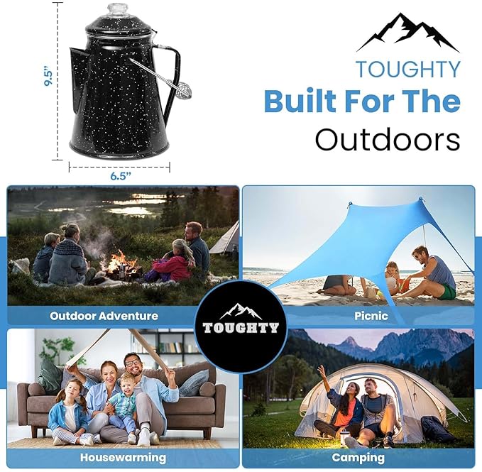 • STURDY ENAMEL BUILD: Crafted from heavy-duty metal and coated with kiln-hardened enamel, this coffee percolator resists scratches, chips, and wear. Ideal for rugged outdoor adventures or daily brewing needs.