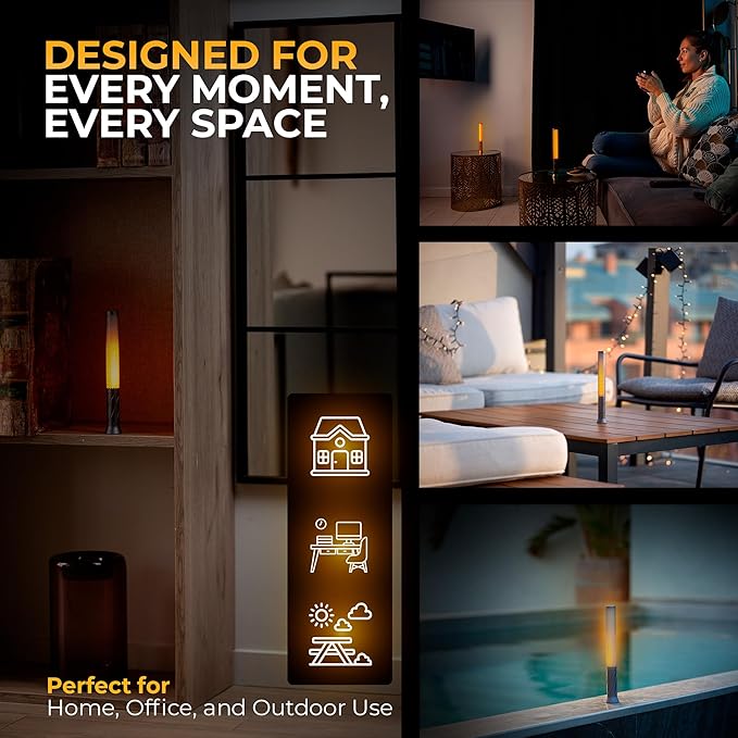 • RECHARGEABLE LAMP WITH EFFORTLESS OPERATION: Equipped with a high-capacity 2600mAh rechargeable battery, this small lamp for nightstand acts as a lantern that provides up to 120 hours (on min. brightness) of continuous runtime. Simply press once for steady lighting or double-tap for the charming mini fireplace mode. With a battery level indicator and convenient USB-C port, it's perfect for on-the-go use and quick charging, whether for dinner parties or everyday usage.