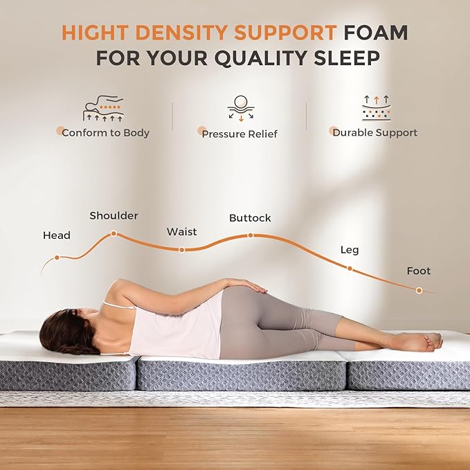 • 【Quality Material】The Sweetnight 4-inch tri-fold mattress is made of soft and comfortable layer and 3-inch high-strength support foam. It offers high-quality resilience to provide comfortable support for your body. The breathable knit fabric ensures proper air circulation and heat regulation. This mattress is the perfect combination of comfort, durability, and convenience, making it an ideal choice for anyone.