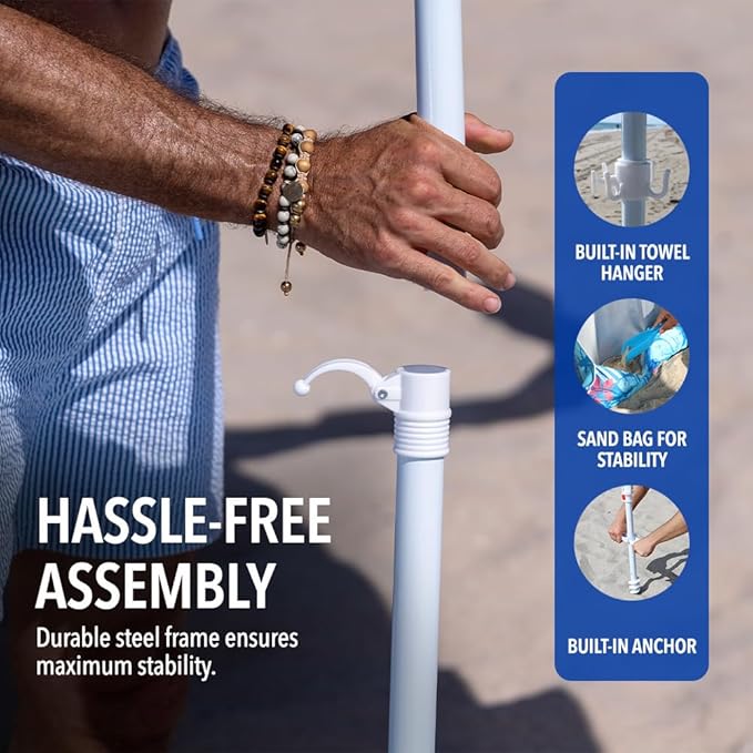 • EXTRA FEATURES FOR CONVENIENCE: Relax in style with built-in sandbags for stability, a towel hanger, and an umbrella table tray for your essentials. Keep your gear organized and enjoy seamless comfort under this heavy-duty portable sunshade.