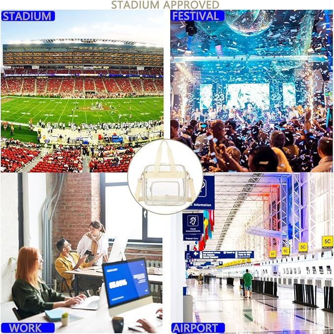 • Stadium Approved: FlowFly clear tote bags for women and men fully comply with the clear bag policy, adhering to the size limit of 12x12x6 inches. This makes it a suitable choice for venues such as stadiums, concerts, sports events, festivals, supermarkets, and more, facilitating easy and fast passage through security lines.