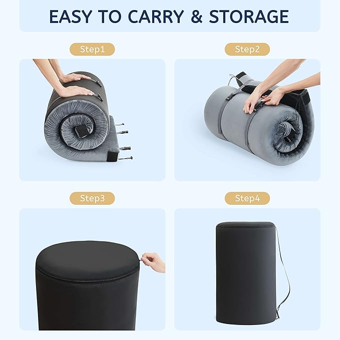 • Portable and Easy to Clean: Designed for life on the go, our portable floor mat rolls up compactly with straps and features a durable zipper for easy cleaning; The removable, washable cover and travel bag make storage and transport a breeze. Adjustable, flexible straps and a complimentary storage bag make it easy to roll up your mattress and immediately head to your next travel destination