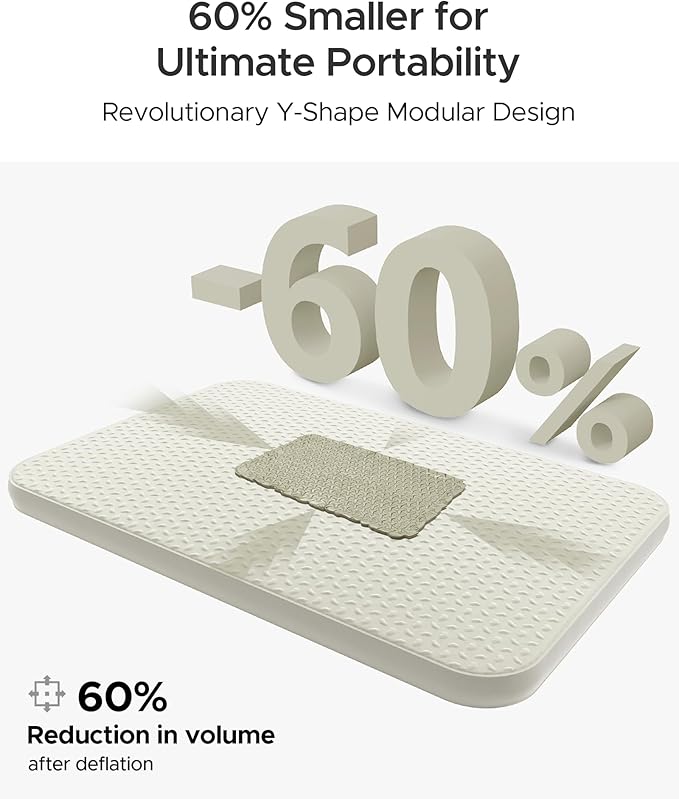 • ๐—œ๐—ป๐—ป๐—ผ๐˜ƒ๐—ฎ๐˜๐—ถ๐˜ƒ๐—ฒ ๐—จ๐—น๐˜๐—ฟ๐—ฎ-๐—ฝ๐—ผ๐—ฟ๐˜๐—ฎ๐—ฏ๐—น๐—ฒ ๐——๐—ฒ๐˜€๐—ถ๐—ด๐—ป: Features an innovative Y-shaped foam telescopic structure that allows the camping mattress to reduce by 60% on volume after deflation. Compared with traditional foam air mattresses, it is lighter and more compact. Weight: 5.3lbs, Rolled up dimensions: 7" x 7" x 27"
