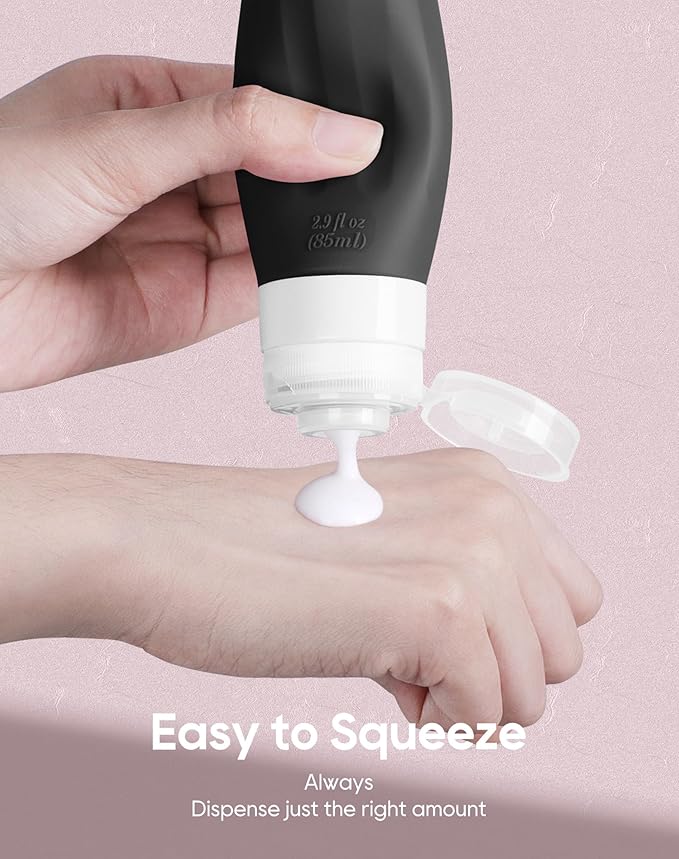 • SAFE SILICONE MATERIAL: Made of Food Grade BPA Free Silicone, this travel set is sturdy, soft, squeezable, flexible and reusable. Safe material guarantee that you can not only use them to store shampoo, conditioner, face soap, sunscreen, creams, lotion or etc, but also safe for food, various seasonings. Soft silicone body make you squeeze out contents easily