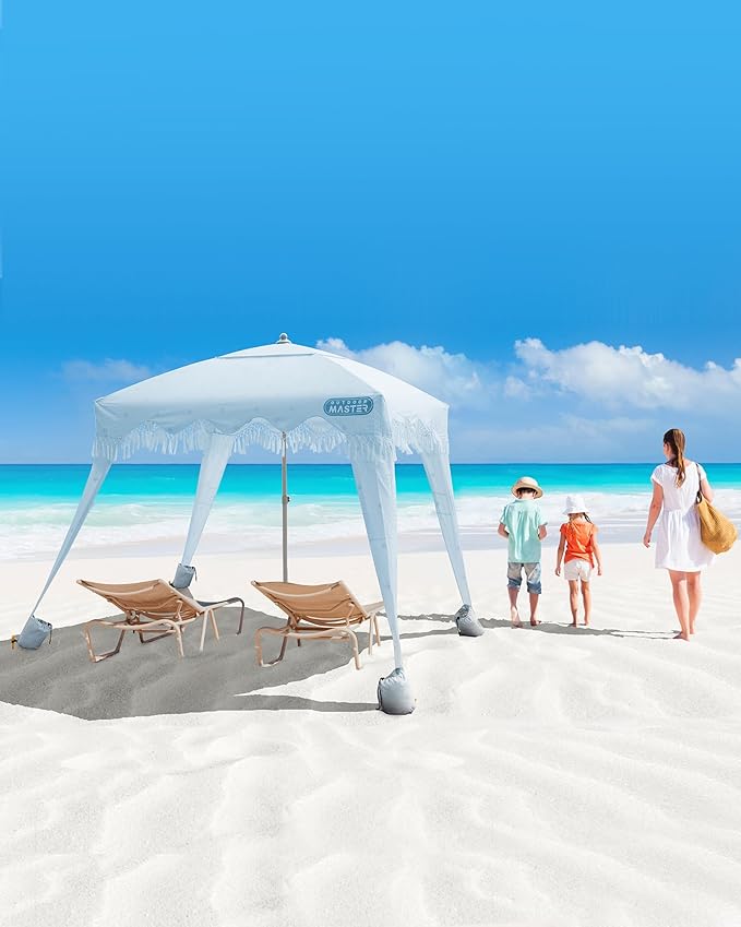 • UV50+ Protection Shade for 4 Person: Beach cabana with fringes, adds romantic moments to your vacation. The detachable side wall blocks angled sunlight for extra shade and privacy. Featuring UPF 50+ sun protection, it shields your skin from harmful UV rays and prevent sunburn - perfect for families, kids.