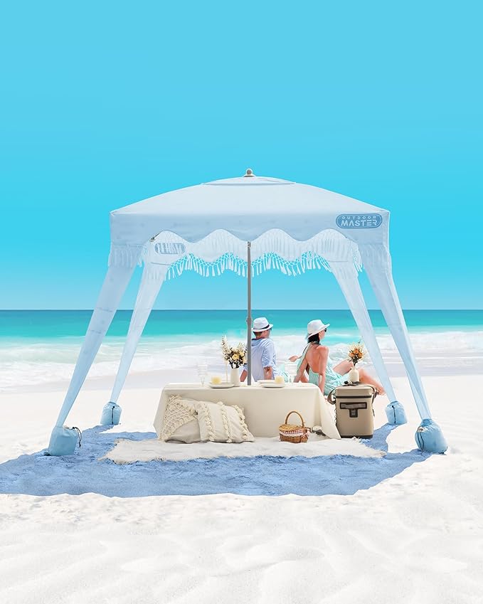 OutdoorMaster Beach Cabana with Fringes, Portable 6' x 6' Beach Canopy for Sand, Easy Set Up Sun Shelter, Included Side Wall, UPF 50+ UV Protection Sun Umbrella - for Family & Friends -Wave Point