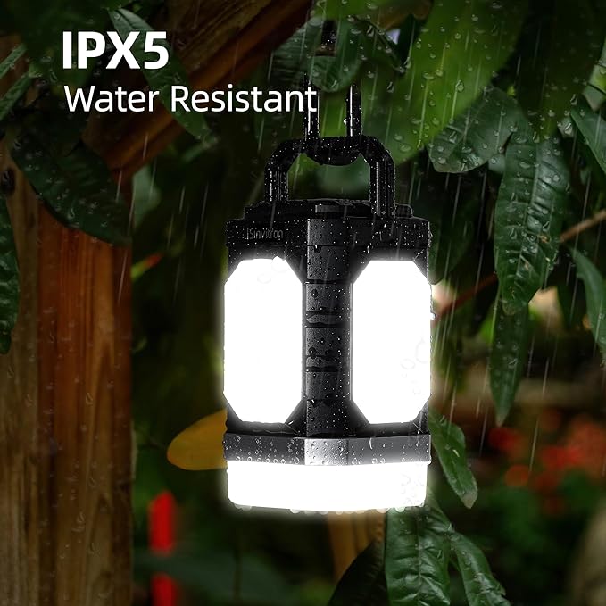 • ✅【Hanging & Portable Rechargeable Lantern】: With its versatile 5-sides light design, you can adjust the lighting as needed. The top hook makes it easy to hang on camping tents, backpacks, or tree branches, freeing your hands. The emergency lights also ideal for emergency situations, as it can be hung high for visibility. This camping lights is your camping essential companion for emergencies, power outages, storms, and more.