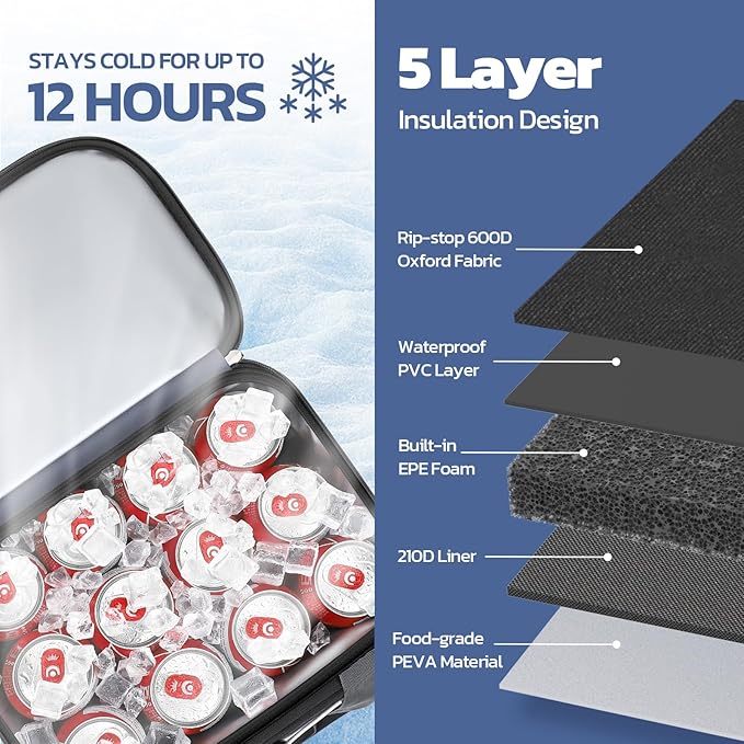 • Large Capacity: With dimensions of 12.87*8.19*11.5 inches, this lightweight (1.87 lbs) lunch bag offers a spacious 20L capacity to accommodate all your needs, holding up to 24 cans of 330ml beverages.