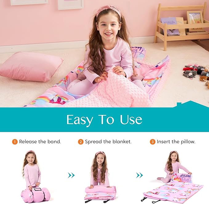 • Convenient design: This toddler daycare nap mat is designed to be a nap pad, quilt and pillow all in one. With user-friendly elastic band design, handle design, and transparent name card pocket, toddlers can easily roll up, store, and carry the nap mat to and from school or during travel, etc.