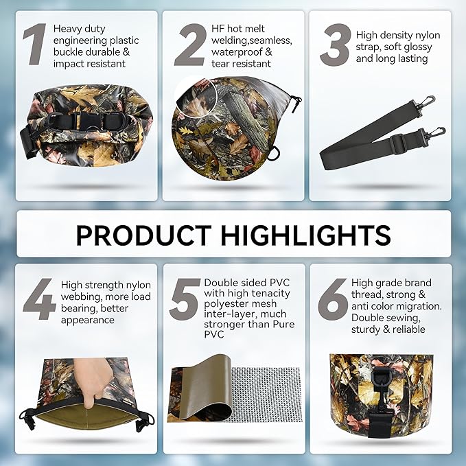 • Floatable and Trackable: The dry sack can float on water without sinking after being rolled up and buckled, so you can quickly track and retrieve your stuff. The D-ring and strap on the bag make it easy to attach to the boat, keeping your stuff always with you without getting lost, allowing you to enjoy thrilling outdoor activities with peace of mind.