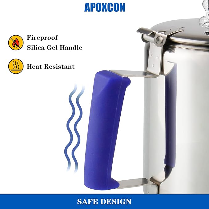 • 【EASY TO USE】 This coffee pot features a drip-free spout and wide hinged lid, making it very easy and safe to use. The blue silica gel handle provides a comfortable grip and stays cool to the touch for easy pouring.