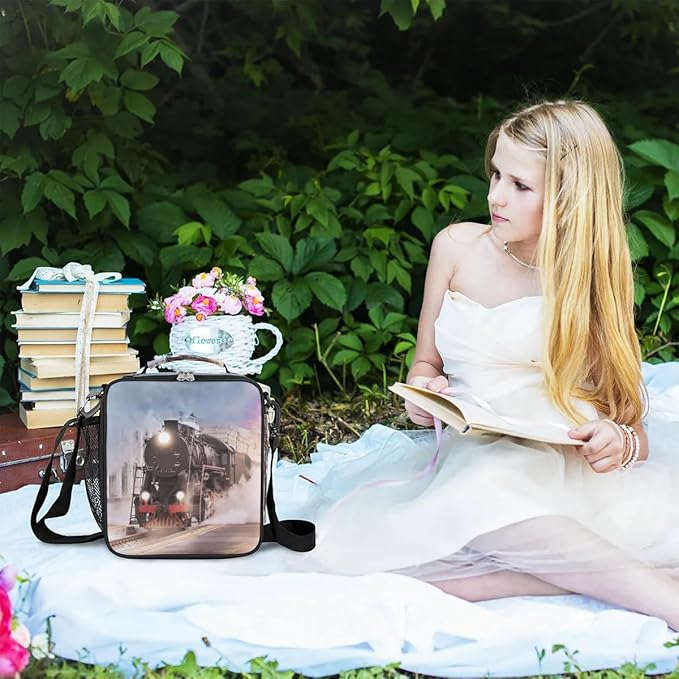 Train Lunch Box for Kids, Vintage Steam Train Lunch Bag for Boys Girls, Reusable Insulated Waterproof Lunch Box with Adjustable Shoulder Strap Thermal Cooler Tote Bag for School Daycare Picnic