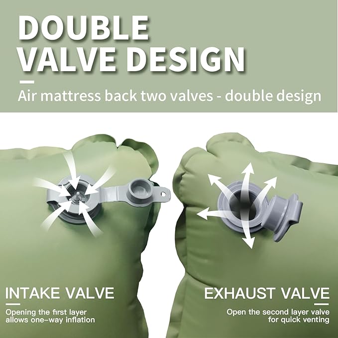 • 【Foot Press to Inflate-Only 1min Needed】 There is no need to inflate with your hands, mouth, or a pump for our camping sleeping pad. It just only takes 1min after you inflate the sleeping mat fully by stamping the spot of the built-in pump with your foot.With anti-leakage films in the valves, you would never worry about air leaking when using it! Besides, super quick to deflate - Vent valve fully open, 1 second can vent.