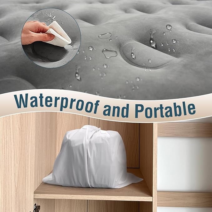 • Non-slip and Stabil Design: The ground part of the Queen Size Inflatable Mattress is designed with a suction cup structure, which can hold the ground firmly. Even though you sit on the edge of the Air Mattress and move around, the Queen Air Mattress with pump always stays balanced and stable.